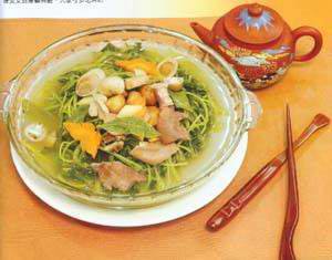 四、家常茶菜茶飯。如茶筍、炸雀舌、茶香排骨、松針棗、怡紅快綠、白玉擁翠、春芽龍須、茶粥、龍須茶面、茶雞玉屑等。