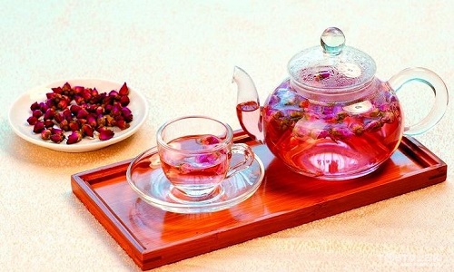 玫瑰花茶由茶葉和玫瑰鮮花窨制而成,是再加工茶類中花茶的一種,所采用的茶坯有紅茶、綠茶。成品茶甜香撲鼻、香氣濃郁、滋味甘美。制作工藝為茶坯與鮮花處理、窨花拼和、起花、復(fù)火、提花。