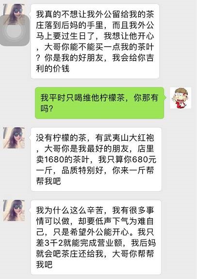 這個(gè)時(shí)候,騙子十有八九會(huì)出現(xiàn)跟你說(shuō)失戀的情況,哭的傷心欲絕,然后跟你傾訴,讓你憐香惜玉,之后會(huì)跑到武夷山爺爺奶奶或者外公外婆家中療傷,幫忙種茶炒茶,學(xué)會(huì)炒茶葉后決定自立自強(qiáng),開(kāi)創(chuàng)自己的事業(yè) —— 炒茶葉,賣(mài)茶葉。