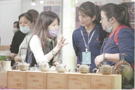 一位臺(tái)灣參展商(左)在介紹公司生產(chǎn)的特色茶具。 本報(bào)記者 王毅 攝
