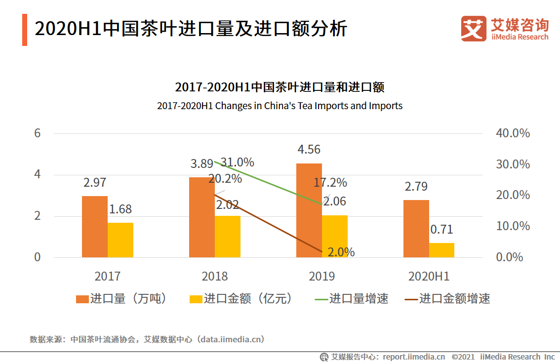 從進(jìn)口情況來看,2019年,中國茶葉進(jìn)口數(shù)量較上一年增長17.2%至4.56萬噸;茶葉進(jìn)口金額較一年增加2.0%至2.06億元。2020年上半年,中國茶葉進(jìn)口量和進(jìn)口金額分別為2.79萬噸和0.71億元。