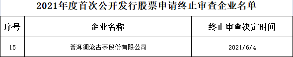據(jù)中國證監(jiān)會(huì)網(wǎng)站6月11日消息,中國證監(jiān)會(huì)決定對普洱瀾滄古茶股份有限公司(以下簡稱“瀾滄古茶”)首次公開發(fā)行股票申請終止審查。