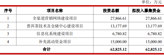 瀾滄古茶原擬在深交所主板公開發(fā)行不超過2000萬股人民幣普通股(A股),占公司本次公開發(fā)行后總股本的比例不低于25%。瀾滄古茶原擬募集資金6.28億元,分別用于“全渠道營銷網(wǎng)絡(luò)建設(shè)項(xiàng)目”、“普洱茶技術(shù)及倉儲(chǔ)中心建設(shè)項(xiàng)目”、“信息化系統(tǒng)建設(shè)項(xiàng)目”、“補(bǔ)充流動(dòng)資金項(xiàng)目”。