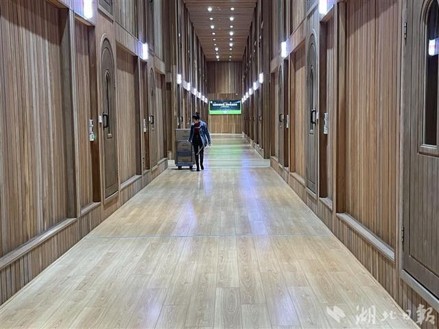 走進(jìn)“洞茶木倉(cāng)”,只見內(nèi)部空間被分割成一間間木屋。透過木門上的玻璃,可見木屋內(nèi)堆碼整齊的一箱箱青磚茶成品。木屋內(nèi),保持適宜青磚茶存儲(chǔ)的恒溫恒濕環(huán)境。一個(gè)木屋就是一個(gè)倉(cāng),“洞茶木倉(cāng)”一共48個(gè)倉(cāng),每個(gè)倉(cāng)可存放20噸青磚茶。
